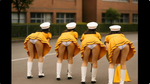 【AI動画】鼓笛隊練習で白アンスコをさらす3人の女の子