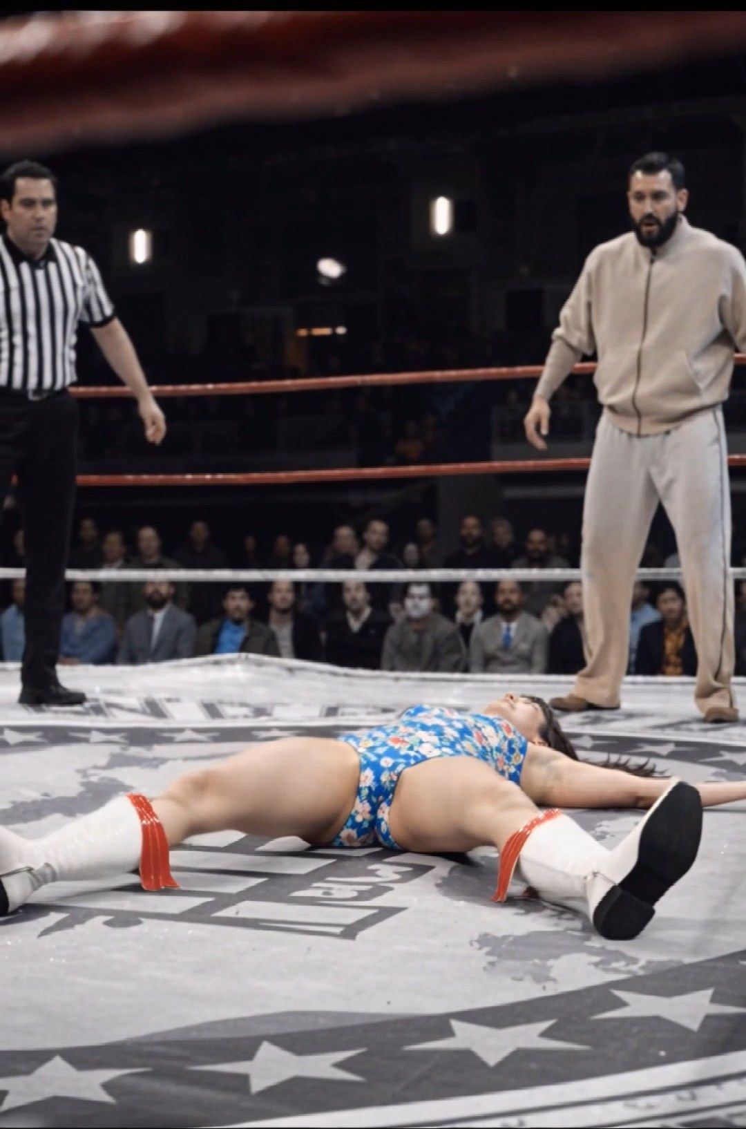 モデル並みの美貌で男性ファンに大人気のセクシー女子プロレスラー 股間丸出しで大の字にダウン!